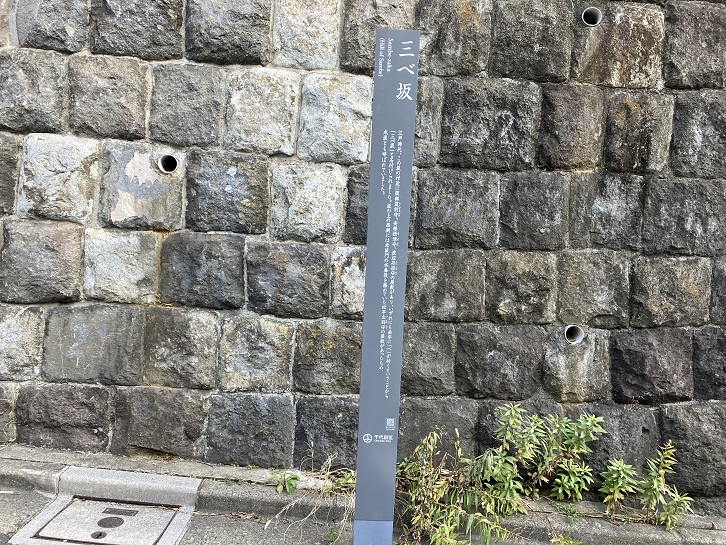 江戸時代、この板の付近に岡部筑前守、安部摂津守、渡辺丹後守の屋敷があり、いずれにも苗字に「べ」が付くということから「三ベ坂」と名付けられました。坂の上の西側には赤坂門の水番役を務めていた松平出羽守の屋敷があったため、水坂とも呼ばれていました。