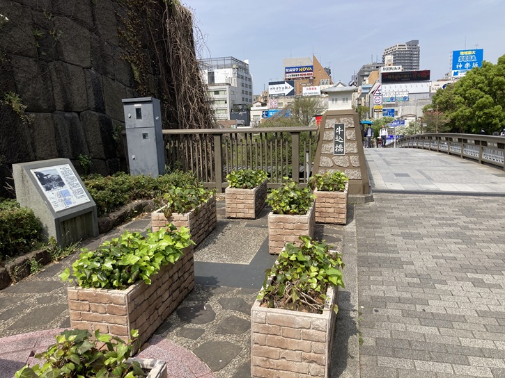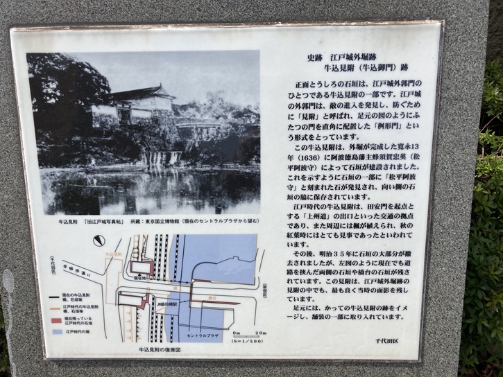 横断歩道を渡った牛込橋の袂の飯田橋駅前交番際に、枡形に使用された石に普請した忠英を指す「阿波守」とかかれた文字が刻まれたモニュメントがあります。
