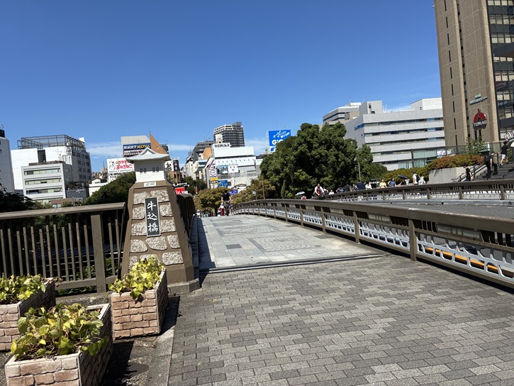 牛込橋は、富士見二丁目から新宿区の神楽坂に通じる早稲田通りにある橋です。江戸城外郭門のひとつ牛込門のあった所に架けられ、今でも橋の手前(千代田区側)の左側に枡形の石垣の一部が残っています。橋の右手の飯田橋との間はセントラルプラザがあります。外濠の水は一旦ここで堰き止められ、姿を消します。そのためこの橋は陸橋のようにも見えます。橋は平成八年に架け替えられています。