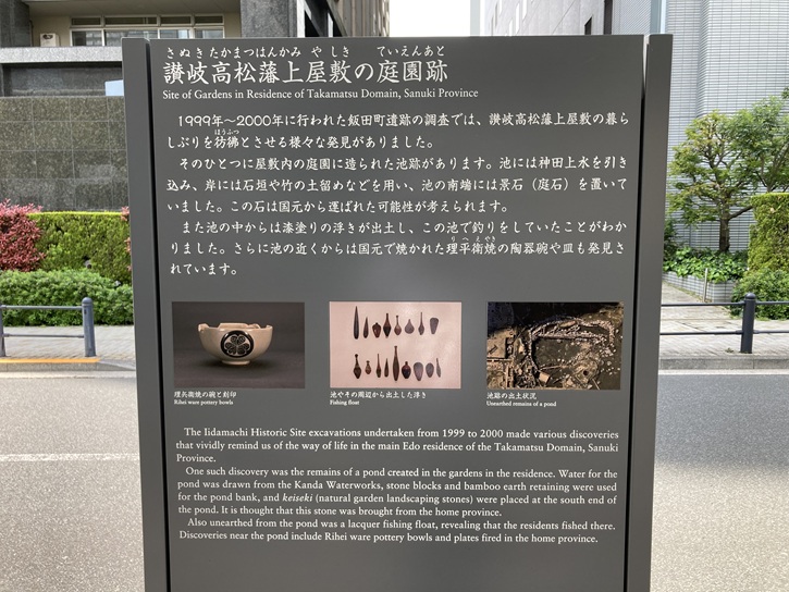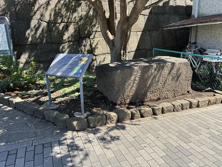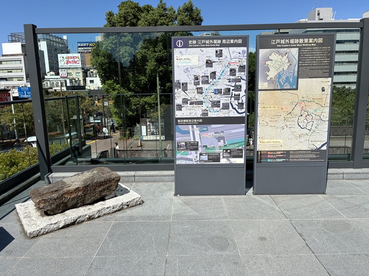 The stone located next to this installation was used to construct the weir located under Ushigome-mon Gate's earthen bridge. Portions of the weir were discovered during the construction of lidabashi Station. Documents detailing