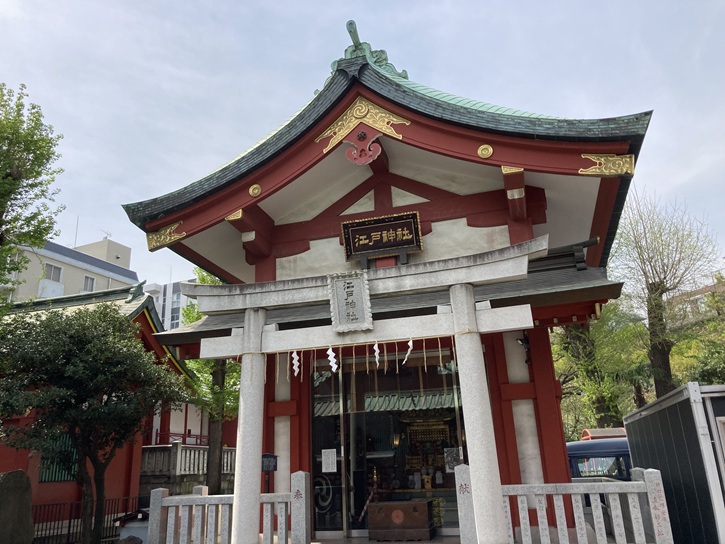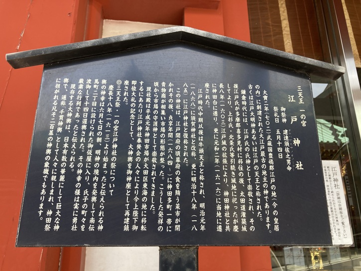 江戸神社は大宝二年(702年)に武蔵国豊島郡江戸の地、今の皇居の中に創建された大江戸最古の地主の神です。古くは江戸大明神・牛頭天王(ごずてんのう)・江戸の天王と称せられたともいわれています。慶長八年(1603年)に江戸城の拡張により神田神社とともに神田台に移り、更に元和二年(1616年)に此の地に遷座しました。