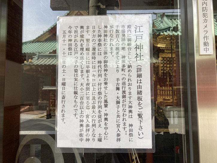 殿内に御帳台として納められおります大神輿は、神田祭に市場発祥の地・神田多町への巡行渡御が行なわれます。千数百人の担ぎてにより、手古舞・大獅子と共に宮入参拝が行なわれます。神田神社の三体の御祭神をお乗せした鳳輦・神輿を中心にした神幸祭には、時代行列・付け祭の行列を従え、土曜日夕方のご還座時には一キロ以上に及ぶ最大の行列となります。翌日曜日には早朝より夜間に至る迄、宮入参拝の神輿が境内を埋め尽くします。大小二百台以上の神輿が街中で担がれる江戸っ子の姿は実に壮観なものです。