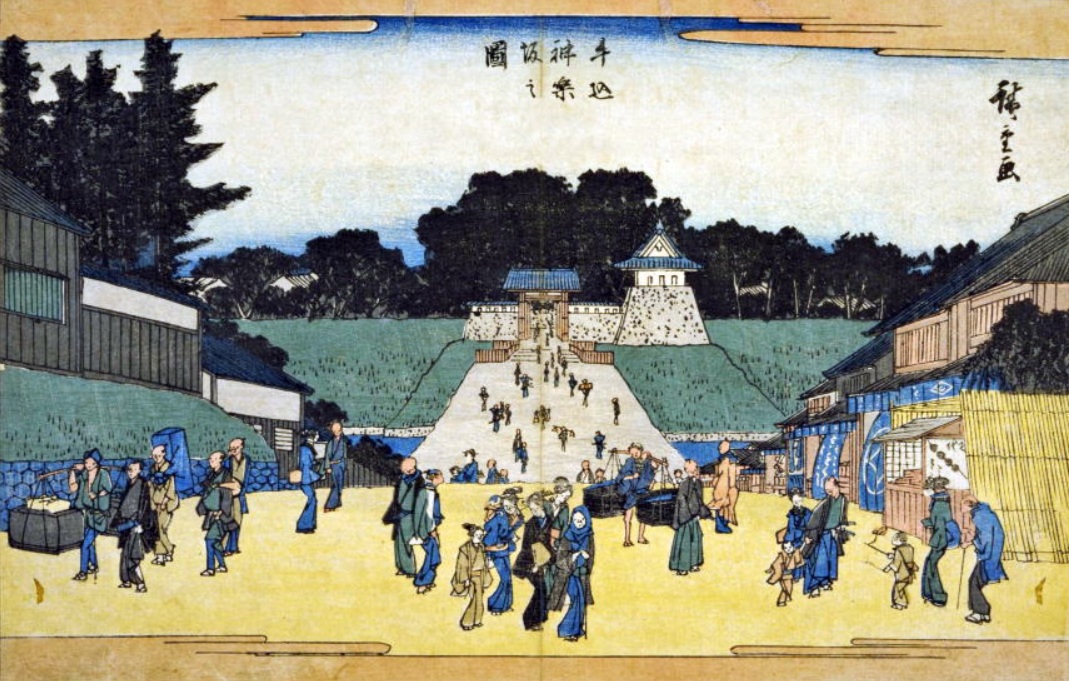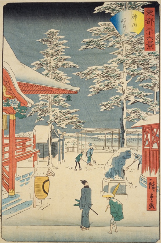 今も湯島台地に建つ神田明神は東側が開けて眺めが素晴らしかったといわれています。二代歌川広重の東都三十六景「神田明神」は、雪の積もった境内の様子を描いています。