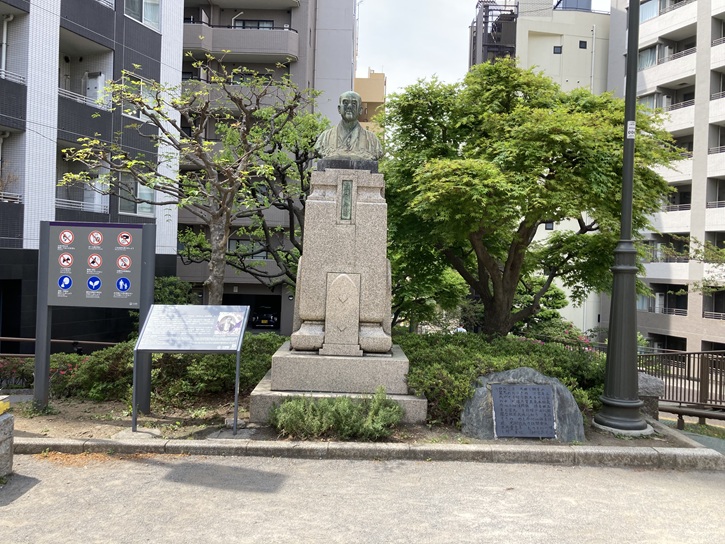 神田明神の境内の奥から宮本公園に下ります。公園の隅に立派な銅像が建っています。