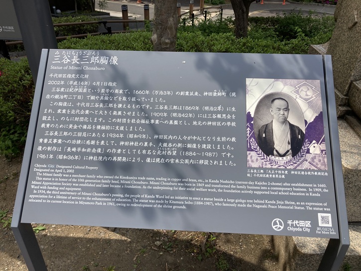 三谷家は紀伊国屋という屋号の商家で、万治三年(1660年)の創業以来、神田塗師町(現在の鍛冶町二丁目)で銅や真鍮などを取り扱っていました。この胸像は、十代目三谷長三郎を讃えるものです。三谷長三郎は明治二年(1869年)に生まれ、家業を近代企業へと大きく発展させました。明治四十二年(1909年)には三谷報恩会を設立し、のちに財団化します。この財団を社会福祉事業への基盤とし、地元の神田区の学校教育のために資金や備品を積極的に支援しました。三谷長三郎の三回忌にあたる昭和九年(1934年)、神田区内の人々が中心となり生前の教育普及事業への功績に感謝を表して、神田神社の裏手、大銀杏の側に銅像を建設しました。像の制作は「長崎平和祈念像」の作者としても有名な北村西望(1884年〜1987年)です。昭和三十六年(1961年)に神社境内の再開発により、像は現在の宮本公園内に移設されました。