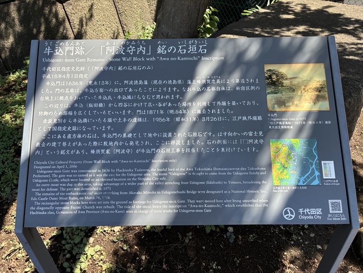 Ushigome-mon Gate was constructed in 1636 by Hachisuka Tadateru, the feudal lord of the Awa Tokushima Domain (current-day Tokushima Prefecture). The gate was so named as it was the exit for the Ushigome area. The name "Ushigome" is thought to come from the Ushigome family and Ushigome Castle, which were located on an elevated location on the Shinjuku City side. An outer moat was dug in this area, taking advantage of a wider part of the valley stretching from Ushigome (Iidabashi) to Yotsuya, broadening the moat for defense. The gate was demolished in 1871. The remains of the embankment and most stretching from Akasaka Mitsuke to Ushigomebashi Bridge were designated as a National Historic Site, Edo Castle Outer Moat Ruins, on March 26, 1256. The rectangular stone blocks here were set into the ground as foctings for Ushigome-mon Gate. They were moved here after being unearthed when the diagonally opposite Fujimi Church was rebuilt. The side of the stcnc bears the inscription "Awa-no-Kamiuchi," which establishes that the