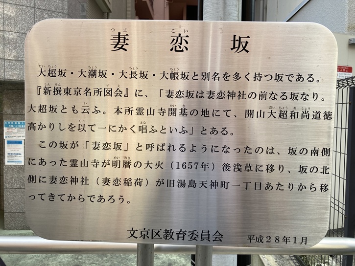大超坂・大潮坂・大長坂・大帳坂と別名を多く持つ坂である。「新撰東京名所図会」に、「妻恋坂は妻恋神社の前なる坂なり。大超坂とも云ふ。本所霊山寺開基の地にて、開山大超和尚道徳高かりしを以て一にかく唱ふといふ」とある。この坂が「妻恋坂」と呼ばれるようになったのは、坂の南側にあった霊山寺が明暦の大火(1657年)後浅草に移り、坂の北側に妻恋神社(妻恋稲荷)が旧湯島天神町一丁目あたりから移ってきてからであろう。