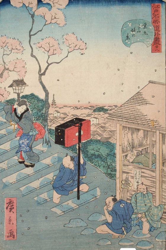 歌川広景の浮世絵「江戸名所道化尽」の中に「妻恋ごみ坂の景」という浮世絵があります。道端の厠で用を足す武士と、鼻をつまんで控えている供の者、というユーモラスな光景が描かれています。歌川広景は、広重の弟子ともいわれていますが、生没年を含めて詳細は不明とのことです。