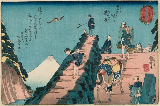 外堀通りに面した湯島聖堂から、秋葉原に向かって下り坂(昌平坂)が続く。本図は、坂下からの眺め。斜面が迫り来るようなダイナミックな構図が魅力的。土手の上に立つ少年が覗き込んでいるのは、神田川。川を開削することで生まれた渓谷と富士山を望めるこの場所は、景勝地として親しまれていた。