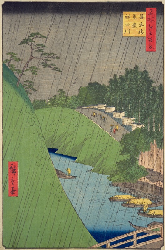 昌平橋のたもとから、神田川越しに昌平坂を眺めた図。国芳の作品Gとは別の角度から昌平坂の魅力を伝える。降りしきる雨のなかにあって、両岸の緑が鮮やかだ。坂に沿って建つ白壁の向こうが、もと幕府の学問所が置かれていた湯島聖堂(昌平坂学問所)。