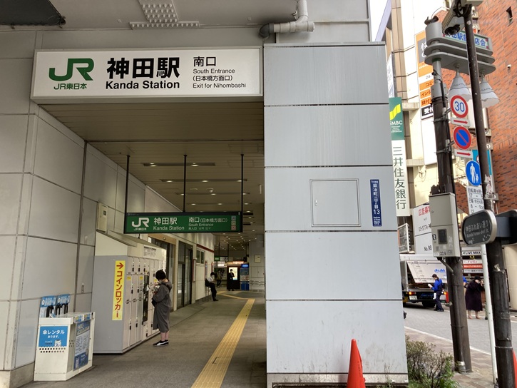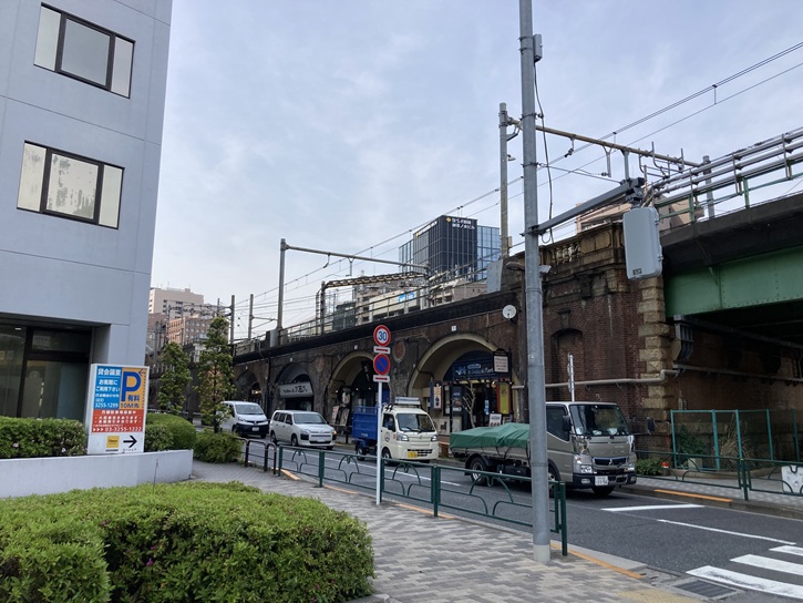神田駅の手前で左折し、JR線の高架下を抜けます。この辺りは「神田富山町」の町域となります。