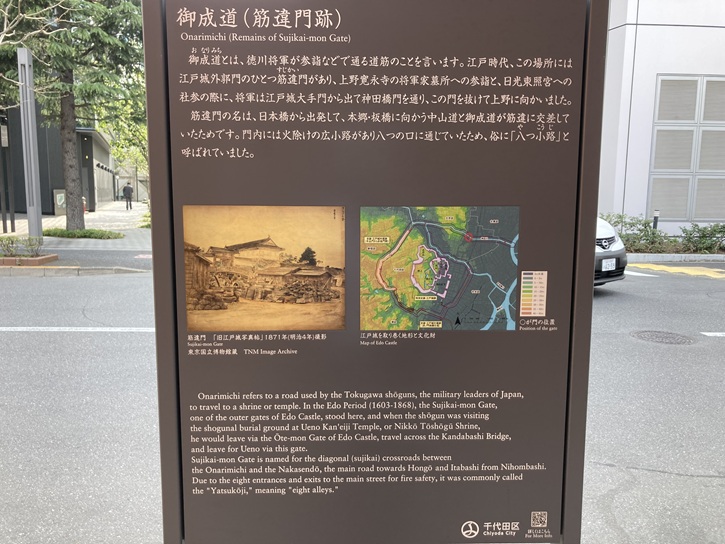 Onarimichi refers to a road used by the Tokugawa shoguns, the military leaders of Japan, to travel to a shrine or temple. In the Edo Period (1603-1868), the Sujikai-mon Gate, one of the outer gates of Edo Castle, stood here, and when the shogun was visiting the shogunal burial ground at Ueno Kan'eiji Temple, or Nikko Toshogu Shrine, he would leave via the Ote-mon Gate of Edo Castle, travel across the Kandabashi Bridge, and leave for Ueno via this gate. Sujikai-mon Gate is named for the diagonal (sujikai) crossroads between the Onarimichi and the Nakasendo, the main road towards Hongo and Itabashi from Nihombashi. Due to the eight entrances and exits to the main street for fire safety, it was commonly called the "Yatsukoji," meaning "eight alleys."
