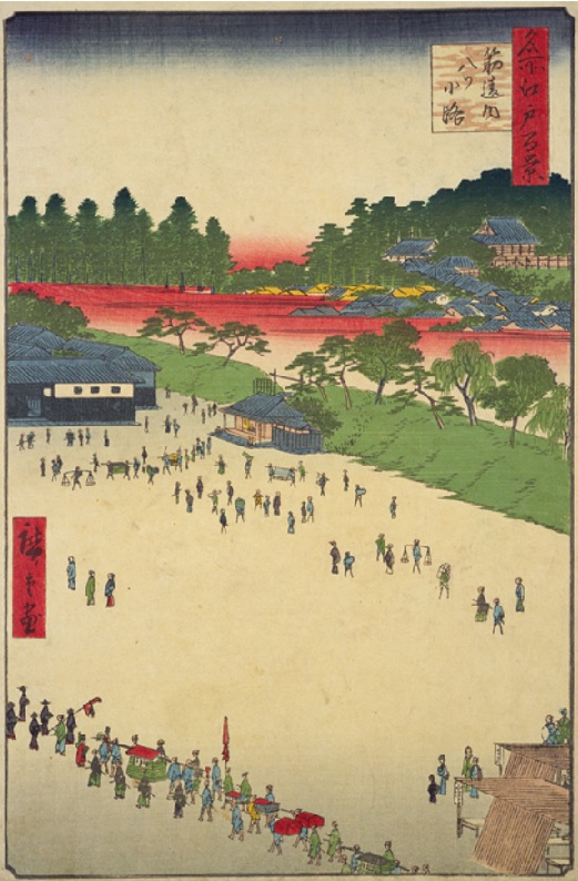 昌平橋から万世橋に向かって旧中山道を50mほど歩いた場所に、江戸城外郭門のひとつ、筋違御門があった。本図は御門の内側に広がるハツ小路を東南から見下ろした景色。ハツ小路は火除地で、中山道や奥州街道など多方面につながる交通の要衝地だった。