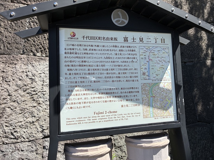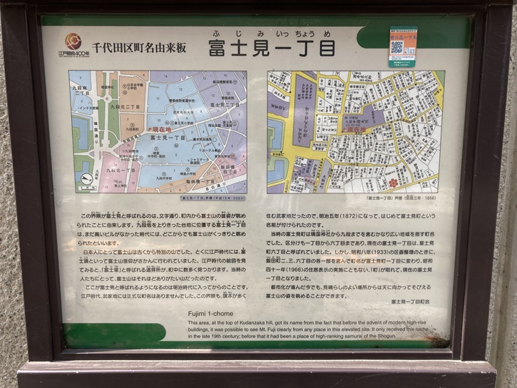 江戸城の名残である外堀(外濠)に面したこの界隈は、武家の屋敷が立ち並ぶ地域でした。当時、武家地には正式な町名がなく、道筋に土手四番町、裏四番町通などと呼称が付いていただけでした。「富士見」という町名が生まれたのは明治五年(1872年)のことで、九段坂を上ったあたりから眺める富士山の姿がじつに素晴らしいことから付けられた名前です。九段坂を上りきった台地(現在の靖国神社周辺)に富士見町一丁目〜六丁目が誕生しました。昭和八年(1933年)、富士見町四丁目は富士見町三丁目と改称します。同じ年、富士見町五丁目と飯田町六丁目の一部が合併し、富士見町二丁目となりました。そして昭和四十一年(1966年