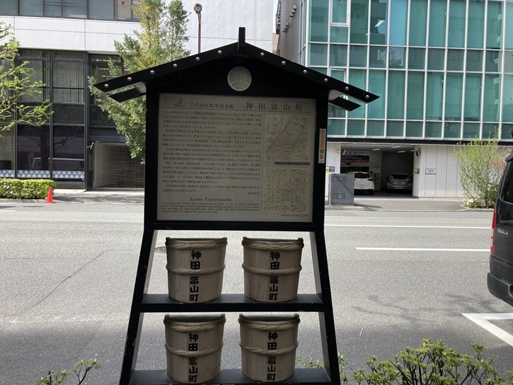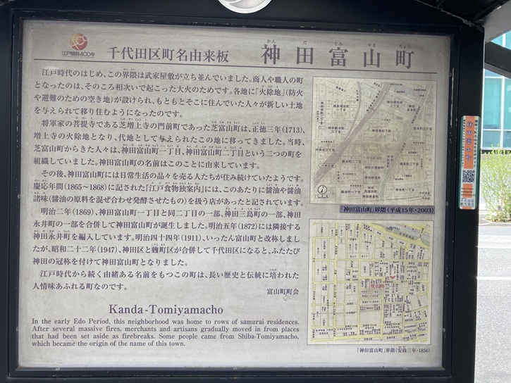 江戸時代のはじめ、この界隈は武家屋敷が立ち並んでいました。商人や職人の町となったのは、そのころ相次いで起こった大火のためです。各地に「火除地」(防火や避難のための空き地)が設けられ、もともとそこに住んでいた人々が新しい土地を与えられて移り住むようになったのです。将軍家の菩提寺である芝増上寺の門前町であった芝富山町は、正徳三年(1713年)、増上寺の火除地となり、代地として与えられたこの地に移ってきました。当時、芝富山町からきた人々は、神田富山町一丁目、神田富山町二丁目という二つの町を組織していました。神田富山町の名前はこのことに由来しています。その後、神田富山町には日常生活の品々を売る人たちが住み続けていたようです。慶応年間(1865年〜1868年)に記された「江戸食物独案内」には、このあたりに醤油や醤油諸味(醤油の原料を混ぜ合わせ発酵させたもの)を扱う店があったと記されています。明治二年(1869年)、神田富山町一丁目と同二丁目の一部、神田三島町の一部、神田永井町の一部を合併して神田富山町が誕生しました。明治五年(1872年)には隣接する神田永井町を編入しています。明治四十四年(1911年)、いったん富山町と改称しましたが、昭和二十二年(1947年)、神田区と麹町区が合併して千代田区になると、ふたたび神田の冠称を付けて神田富山町となりました。江戸時代から続く由緒ある名前をもつこの町は、長い歴史と伝統に培われた人情味あふれる町なのです。