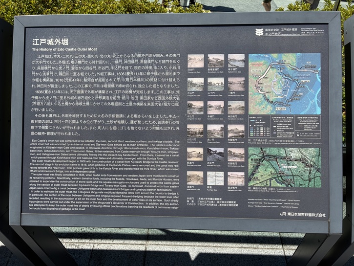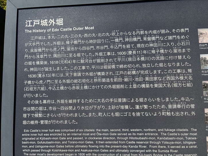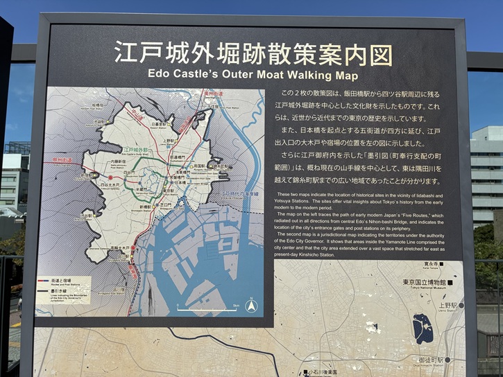 江戸城外堀散策案内図には、周辺の見所や外堀の概要が記されています。