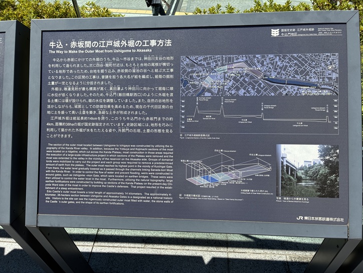 with the Kanda River. In order to control the flow of water and prevent flooding, weirs were constructed to around gates, such as Ushigome-mon Gate, which were located on earthen bridges. These weirs were then utilized to control the water level in the moat. Furthermore, utilizing the natural topography, large earthen fortifications were constructed by building up sections of the Kanda Plateau on the present-day Chiyoda Ward side of the moat in order to improve the Castle's defenses. That project resulted in the establishment of a steep embankment. Edo Castle's outer moat boasts a total length of approximately 14 kilometers. The approximately 4-kilometer, 38-hectare section between Ushigome and Akasaka Gates is a designated as a national historic site. Visitors to the site can see the ingeniously constructed outer moat filled with water, the stone walls of the Castle 's outer gates, and the shape of its earthen fortifications.