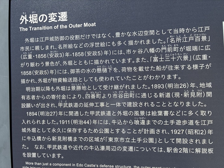 外堀は江戸城防御の役割だけではなく、豊かな水辺空間として当時から江戸市民に親しまれ、名所絵などの浮世絵にも多く描かれました。「名所江戸百景」(広重・安政三年【1856年】〜安政五年【1858年】)には、市ヶ谷八幡の門前町が堀端に広がり賑わう景色が、外堀とともに描かれています。また、「富士三十六景」(広重・安政五年【1858年】)には、御茶の水の懸樋下を、荷物を載せた船が往来する様子が描かれ、外堀が物資輸送路としても使われていたことがわかります。明治期以降も外堀は景勝地として受け継がれました。明治二十六年(1893年)、地域有志者からの寄付金により、四番町より市谷田町に通じる新道(現・新見附)開設願いが出され、甲武鉄道の延伸工事と一体で建設されることとなりました。明治二十七年(1894年)に開通した甲武鉄道と外堀の風景は絵葉書などに多く取り入れられました。明治四十四年(1911年)には、牛込から喰違までの土手遊歩道を江戸城外堀として永久に保存するため公園とすることが計画され、昭和二年(1927年)に牛込橋から新見附橋までの区域が「東京市立土手公園」として開設されました。なお、甲武鉄道や近代の牛込濠周辺の変遷については、駅舎2階に解説板を設置しています。