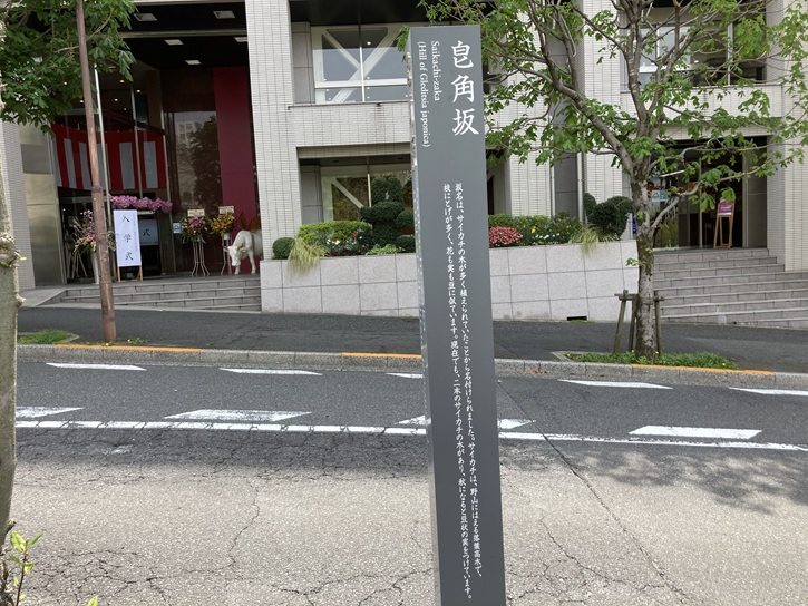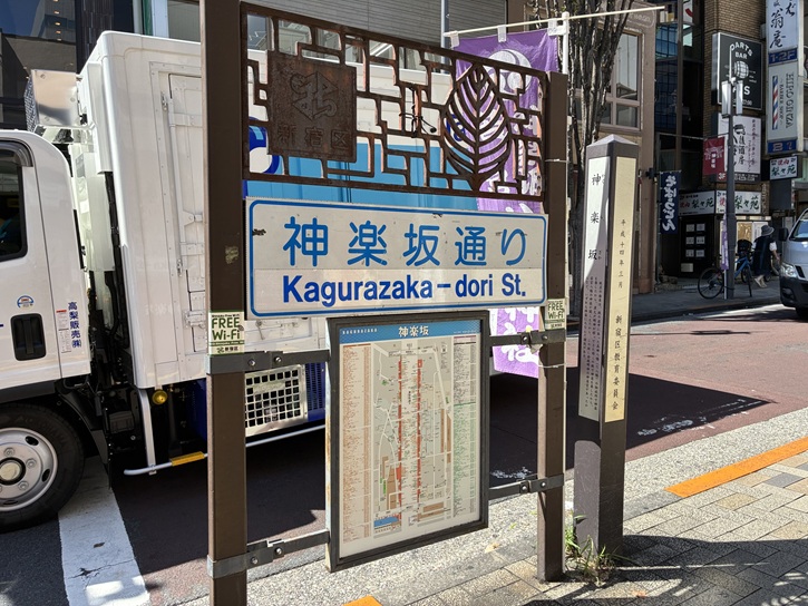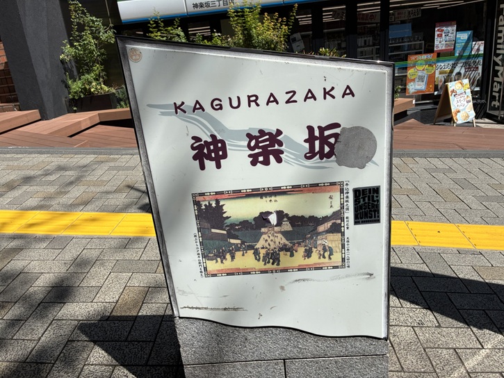 外堀通りを渡って神楽坂に入ります。神楽坂は、飯田橋駅前の神楽坂下交差点付近から善国寺付近まで上る、長さが約300mほどの緩やかな坂です。坂名の由来には、