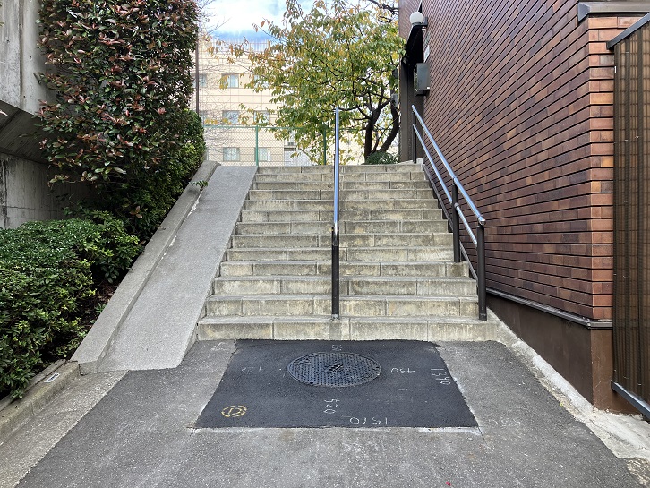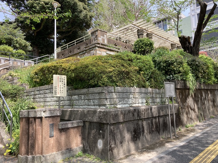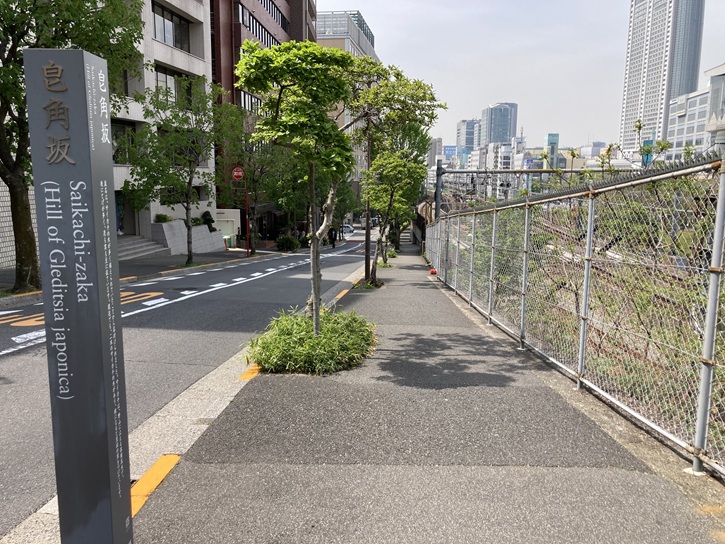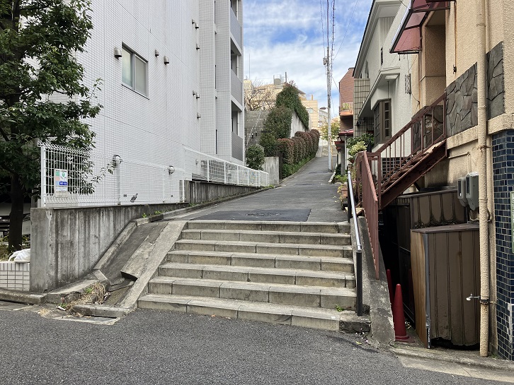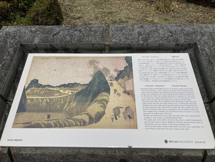 この坂は現在も存在し、妻恋坂の途中から妻恋神社の東側を北に入る狭い道で、長さは約60mほどあります。妻恋坂から直ぐに7段の石段があり、その先は緩やかな坂道になっていて、最上部は再び13段の階段になっています。階段の上はフェンスを隔てて東都文京病院(旧小平記念東京日立病院)の敷地になっています。爪先を立てて上る坂という意味で立爪坂の名前になりました。昔はそれだけ急な坂だったのでしょう。別名を芥坂といいますが、浮世絵に石段が描かれているので、立爪坂が浮世絵に描かれた坂なのでしょう。