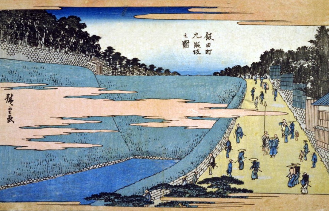 靖国通りの俎橋あたりから坂の上方を仰ぎ見た図。当時は、荷車を押す「押し屋」が待機して働いていたほど急勾配だったという。左手前の牛ヶ淵は、江戸市中の飲料用水を確保するために設けられたダムだった。北斎も「九段牛ヶ淵」(右)の作品を残している。
