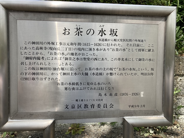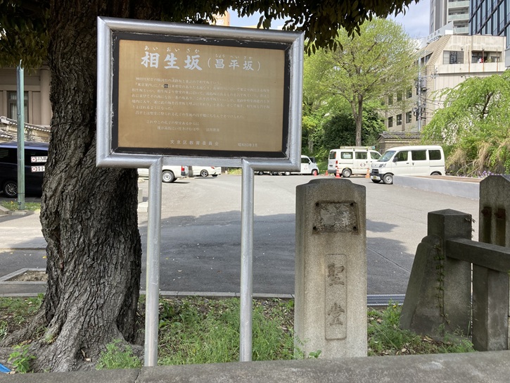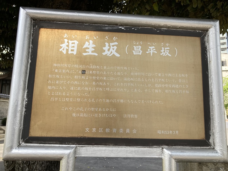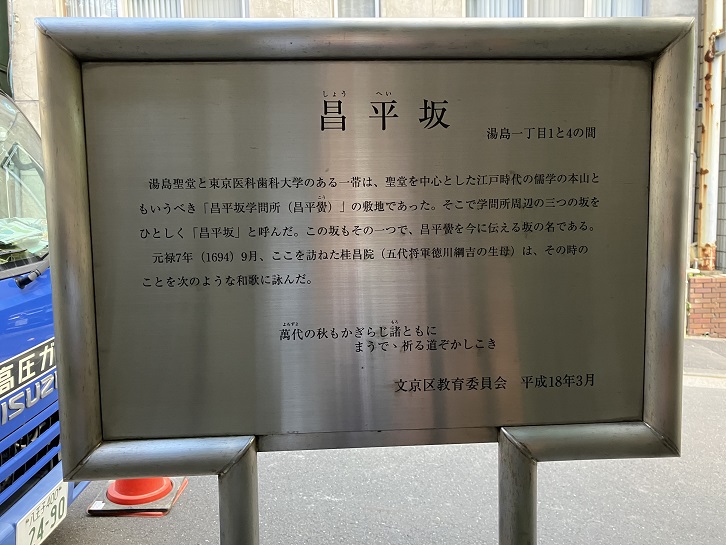 湯島聖堂と東京医科歯科大学のある一帯は、聖堂を中心とした江戸時代の儒学の本山ともいうべき「昌平坂学問所(昌平黌)」の敷地であった。そこで学問所周辺の三つの坂をひとしく「昌平坂」と呼んだ。この坂もその一つで、昌平黌を今に伝える坂の名である。元禄七年(1694年)9月、ここを訪ねた桂昌院(五代将軍徳川綱吉の生母)は、その時のことを次のような和歌に詠んだ。