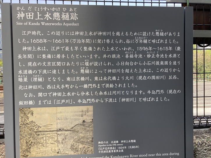 Shoheibashi Bridge is one of the bridges that crossed Edo Castle's outer moat (current-day Kandagawa River) and is said to have been built in the Kanei Era (1624-44). It was also called Imoaraibashi Bridge as Imoarai Inari (current-day Otahime Inari Shrine) stands on Surugadai upwards from the bridge. It was also referred to as Aioibashi Bridge. It later came to be known as Shoheibashi Bridge after Shoheikyo, the birthplace of Confucius, following erection of a shrine to Confucius in Yushima in 1691. Along with Sujikai-mon Gate, which was a short distance downstream, the bridge was used as a major thoroughfare for the Nakasendo Road and the Nikko Onarimichi Road, and there was a bustling public square called Yatsukoji at the south end of the bridge.
