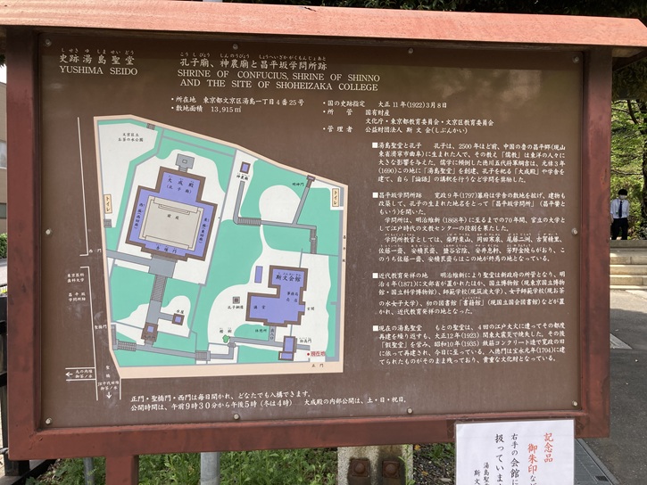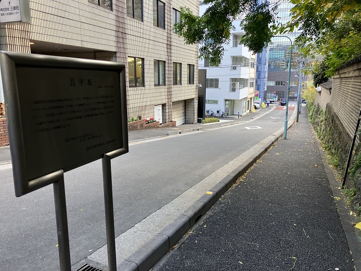 昌平坂は長さ約95mほどの緩やかな坂で、別名を昌平脇坂・団子坂といいます。江戸時代に昌平黌が開所した時は、学問所周辺の三つの坂はひとしく「昌平坂」と呼ばれました。その後、3つの坂名に分れましたが、この坂は昌平坂の名前を引き継ぎました。