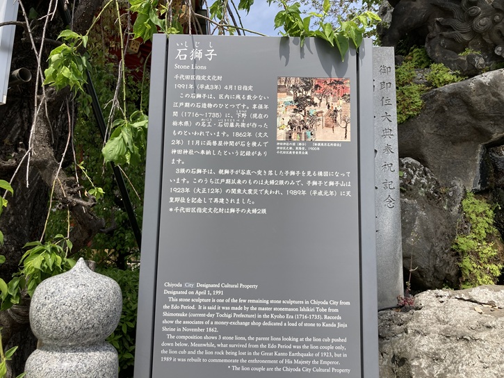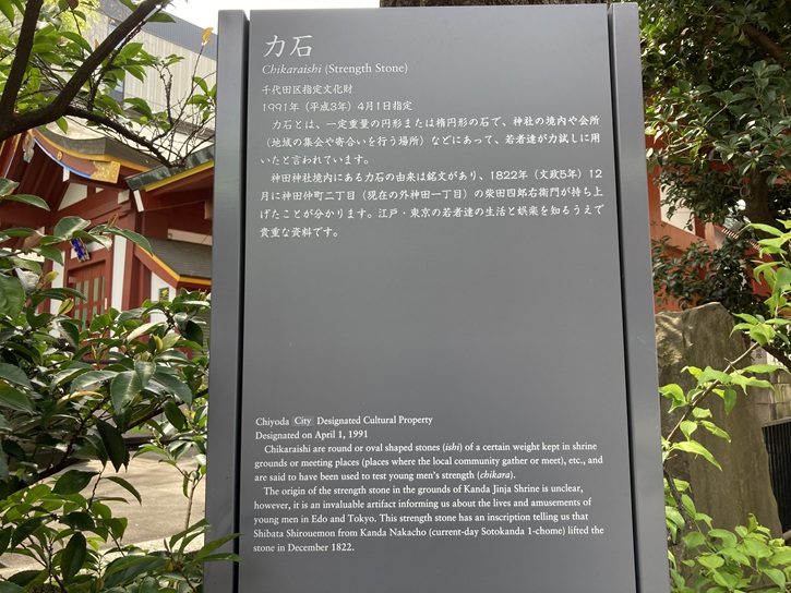 Chikaraishi are round or oval shaped stones (ishi) of a certain weight kept in shrine grounds or meeting places (places where the local community gather or meet), etc., and are said to have been used to test young men's strength (chikara). The origin of the strength stone in the grounds of Kanda Jinja Shrine is unclear, however, it is an invaluable artifact informing us about the lives and amusements of young men in Edo and Tokyo. This strength stone has an inscription telling us that Shibata Shirouemon from Kanda Nakacho (current-day Sotokanda 1-chome) lifted the stone in December 1822.