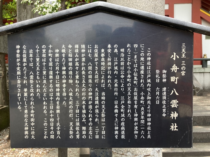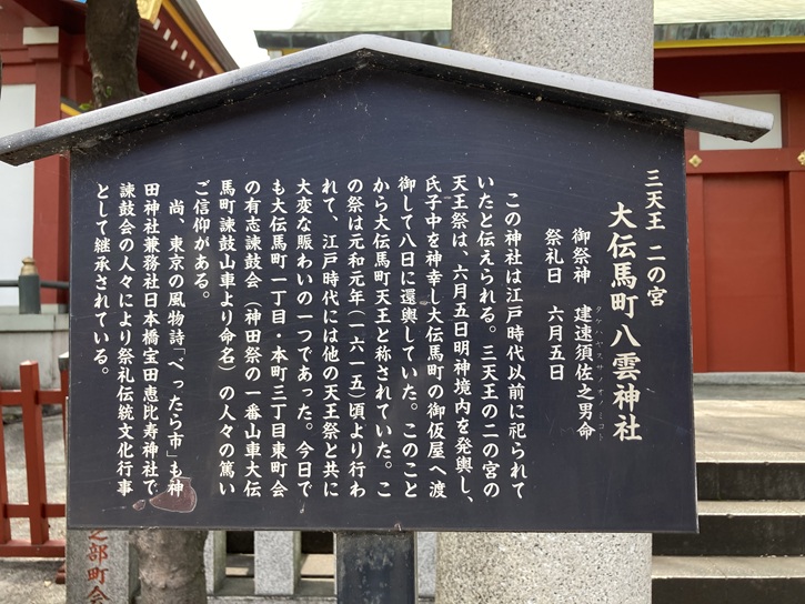 大伝馬町八雲神社は、神田神社境内の神社(摂社)で小舟町八雲神社、江戸神社とともに江戸時代には、祇園牛頭天王三社(ごずてんのうさんじゃ)と呼ばれていました。
