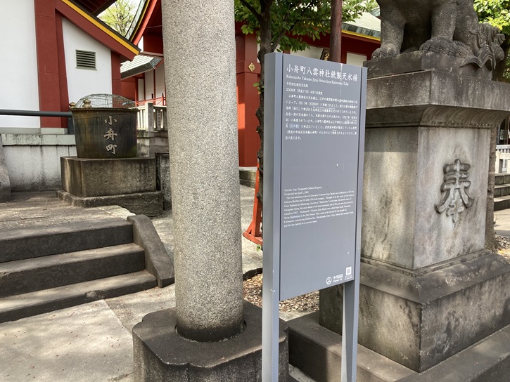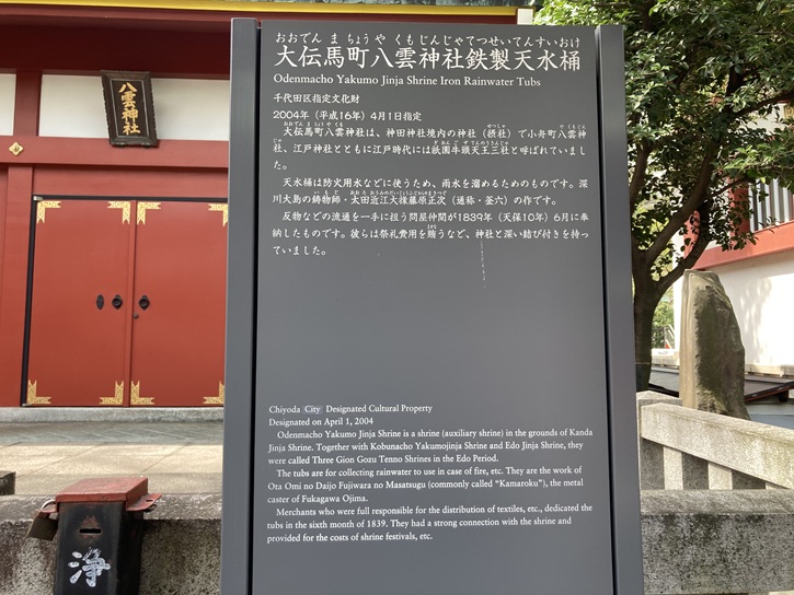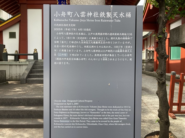 The iron rainwater tubs at Kobunacho Yakumo Jinja Shrine were dedicated in 1811 by Enshuya Shinbee and 10 other Edo fish mongers. Thought to be the work of Ota Omi no Daijo Fujiwara no Masatsugu, known as "Kamaroku" at the time, the metal caster of Fukagawa Ojima, the main shrine's left-hand rainwater tub of the pair was lost, but was remade in 1857. Kobunacho Yakumo Jinja Shrine was called Gion Gozu Tennosha Shrine (Sannomiya) in the Edo Period. They came to be revered by the people of Kobunacho (current-day Kobunacho, Nihombashi, Chuo City), where fish mongers lived, and this has carried on to current times.