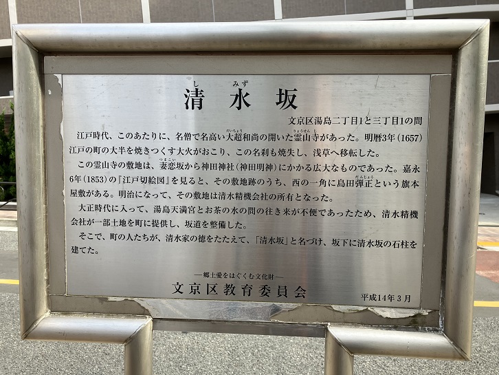 江戸時代、このあたりに、名僧で名高い大超和尚の開いた霊山寺があった。明暦三年(1657年)江戸の町の大半を焼きつくす大火がおこり、この名刹も焼失し、浅草へ移転した。この霊山寺の敷地は、妻恋坂から神田神社(神田明神)にかかる広大なものであった。嘉永六年(1853年)の「江戸切絵図」を見ると、その敷地跡のうち、西の一角に島田弾正という旗本屋敷がある。明治になって、その敷地は清水精機会社の所有となった。大正時代に入って、湯島天満宮とお茶の水の間の往き来が不便であったため、清水精機会社が一部土地を町に提供し、坂道を整備した。そこで、町の人たちが、 清水家の徳をたたえて、「清水坂」と名づけ、坂下に清水坂の石柱を建てた。
