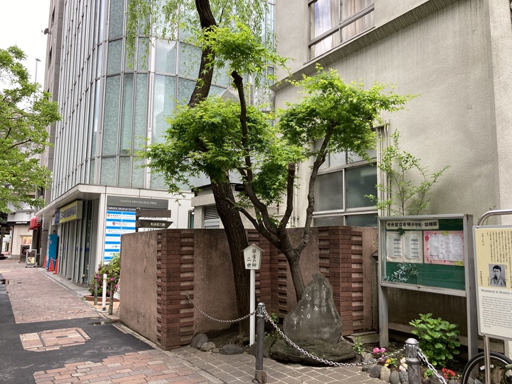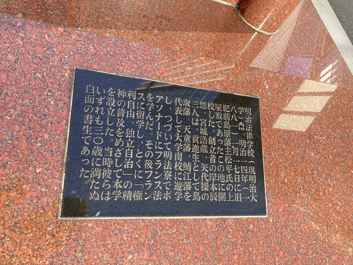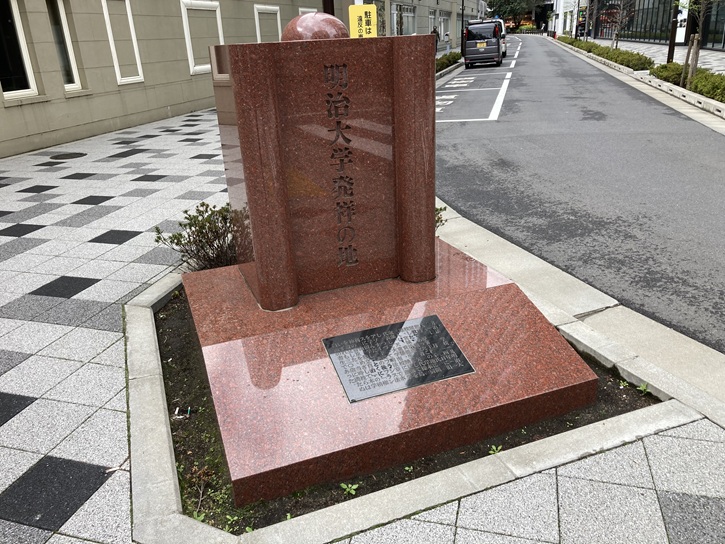 もうひとつの明大発祥の地の案内板が石碑の横に置かれています。同じような内容ですが、こちらは千代田区が設置したものです。