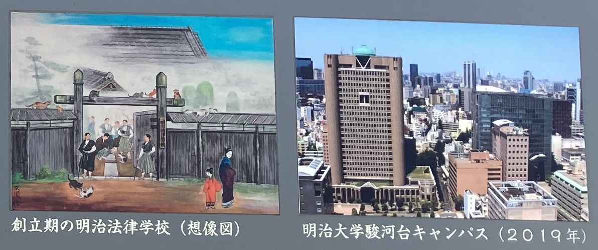 明治法律学校(現明治大学)は、明治十四年(1881年)一月十七日に旧肥前島原藩主松平氏の上屋敷であったこの地に開校した。創立者の岸本辰雄・宮城浩蔵・八代操の三人は、貢進生として鳥取藩・天童藩・鯖江藩を代表して大学南校に遊学し、つづいて明法寮でボアソナードにフランス法を学んだ。その後フランスに留学し、とくに「権利自由・独立自治」の精神の普及をめざして本学を設立した。当時彼らはいずれも三十歳に満たぬ白面の書生であった。