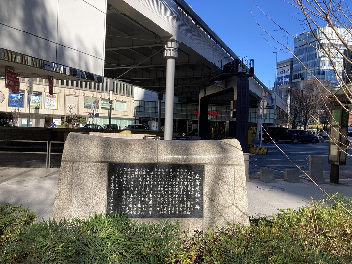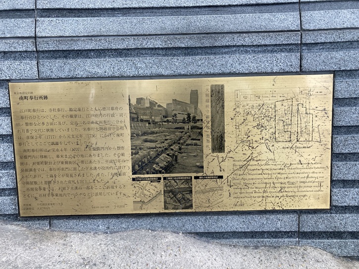 駅前広場に「南町奉行所跡の碑」が建っています。宝永四年(1707年)から幕末まで、数寄屋橋門内の此の地に南町奉行所が置かれ、「大岡越前守忠相」が南町奉行を約20年間務めていました。南町奉行所は老中の支配下にあり、江戸町人地の行政・司法・警察などの職務を担っていた組織です。大岡越前守忠相は、八代将軍徳川吉宗の側近として「享保の改革」を支え、江戸市中の行政に携わりました。石碑の横には、当時の「石組下水溝」が復元展示されています。