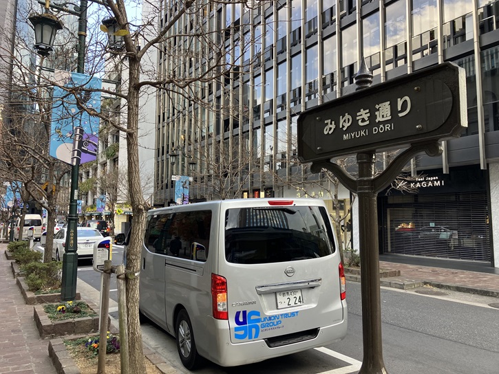 数寄屋橋交差点で右折して、みゆき通に入ります。みゆき通りは、天皇の行幸(御幸【みゆき】)に際して通行したことを記念して命名されています。