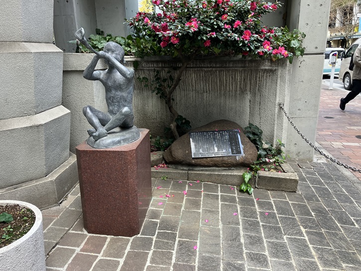 数寄屋橋公園の一角に、「君の名は」の脚本を書いた菊田一夫の石碑が置かれています。「数寄屋橋 此処に ありき 菊田一夫」と書いてあります。数寄屋橋は、その昔は銀座から江戸城の数寄屋橋御門に続く道の途中にかけられていた橋です。菊田一夫は劇作家としてさまざまな芝居を書いたのですが、なんといっても有名な作品が、昭和二十七年から2年間にわたって放送されたNHKラジオドラマ「君の名は」です。数寄屋橋は、延々とすれ違いを続ける主人公の恋人二人が初めて出会った運命の場所でした。このドラマは昭和二十八年に佐田啓二と岸恵子の主演で映画化もされ、空前の大ヒットとなりました。このようにして数寄屋橋の名は昭和のドラマによって全国に知られるようになったわけですが、「数寄屋」という橋の名は、近くに住んでいた茶人の織田有楽斎(織田信長の弟)が営んだ数寄屋造りの茶室に由来するともいわれる江戸以来の由緒ある名前です。また、有楽町という町名は「有楽斎」の邸宅があったことから名付けられたのです。更にいうと、数寄屋橋公園に隣接する泰明小学校は、北村透谷や島崎藤村の母校として知られていますが、透谷というペンネームは、「すきや」をもじってつけたものだそうです。