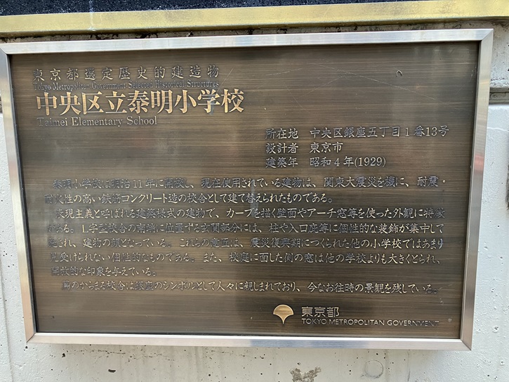 泰明小学校は明治十一年に開校し、現在使用されている建物は、関東大震災を機に、耐震・耐火性の高い鉄筋コンクリート造の校舎として建て替えられたものである。表現主義と呼ばれる建築様式の建物で、カーブを描く壁面やアーチ窓等を使った外観に特徴がある。L字型校舎の南端に位置する玄関部分には、柱や入口庇等に個性的な装飾が集中して施され、建物の顔となっている。これらの意匠は、震災復興期につくられた他の小学校ではあまり見受けられない個性的なものである。また、校庭に面した側の窓は他の学校よりも大きくとられ、開放的な印象を与えている。蔦のからまる校舎は銀座のシンボルとして人々に親しまれており、今なお往時の景観を残している。