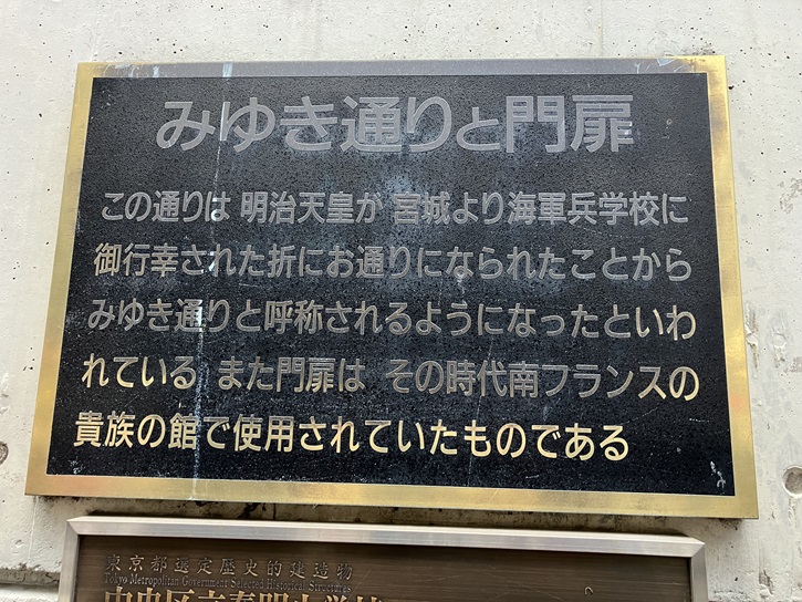 この通りは、明治天皇が宮城より海軍兵学校に御行幸された折にお通りになられたことから、みゆき通りと呼称されるようになったといわれている。また門扉はその時代南フランスの貴族の館で使用されていたものである。