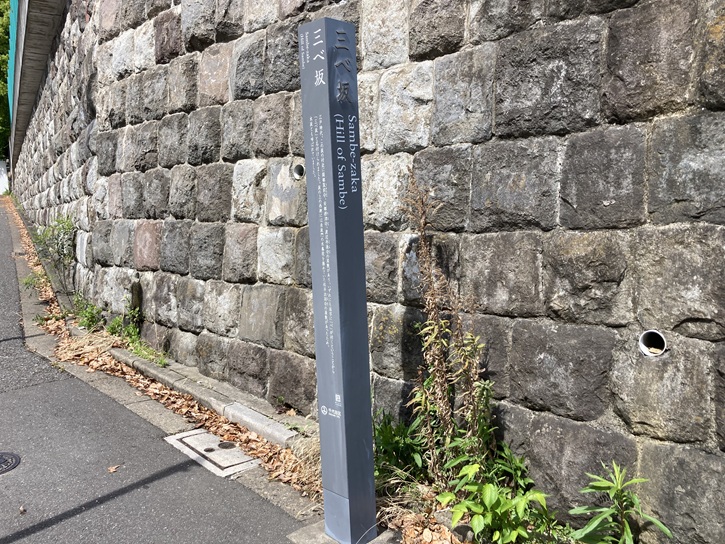 江戸時代、この板の付近に岡部筑前守、安部摂津守、渡辺丹後守の屋敷があり、いずれにも苗字に「べ」が付くということから「三ベ坂」と名付けられました。坂の上の西側には赤坂門の水番役を務めていた松平出羽守の屋敷があったため、水坂とも呼ばれていました。