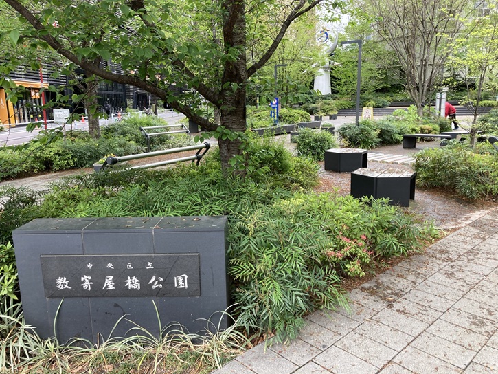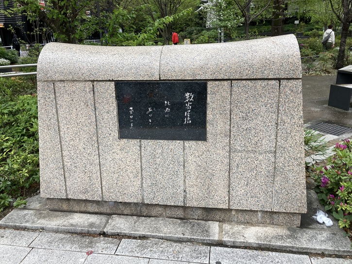 公園の前には、「数寄屋橋の碑」も建っています。数寄屋橋は、もともとは寛永六年(1629年)江戸城外濠に架けられた橋でした。、関東大震災後の帝都復興事業によって、昭和四年(1929年)に石造りの二連アーチ橋に架け替えられ、北側に日劇と朝日新聞社、南側に銀座東芝ビルと泰明小学校を臨む風景は東京の代表的な水辺の景観でした。現在は、晴海通りと外堀通りの交差点名として残っているほか、周辺の建物に数寄屋橋の名を付しているものが多くみられます。「有楽町で逢いましょう」もこの地だったのかもしれません。