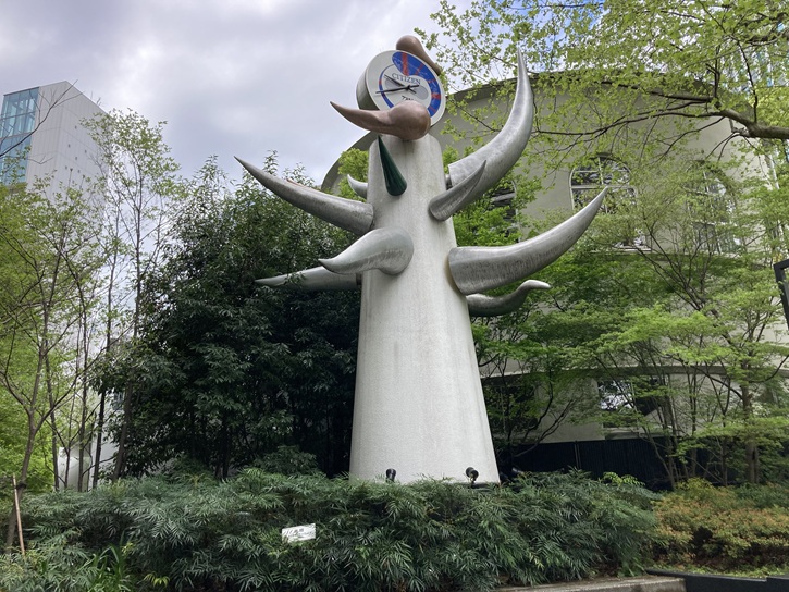 数寄屋橋公園の奥に見える「若い時計台」の彫像は岡本太郎の作です。昭和四十五年(1970年)に開催された大阪万博の「太陽の塔」にそっくりですが、この「若い時計台」はそれよりも4年早い昭和四十一年(1966年)の制作です。岡本太郎氏の「芸術は爆発だ」の掛け声と共に、あのギラッとした鋭い目つきは、強い印象を与えました。この塔は作られてからすでに40数年経っていますけど、周りの変化にもびくともせず、時代の流れを感じさせずに、より強烈なインパクトを与えています。当時の数寄屋橋界隈は「みゆき族」など最先端のファッションや文化が生まれる街として知られる一方で、集まる若者たちの風紀の低下が問題視されていたといい、時計台製作は「青少年の健全育成」が目的でした。岡本太郎は同所を訪れて「やたら色、形が混乱した雑踏の場。ひどい」と嘆きながら、「ただすっきりとしたものを作ったって埋もれてしまうだけ。激しいと同時に、静まった、周囲と異質でありながらピタリとあの場所に生きる、彩の濃い象徴を」と構想し、円柱スタイルの台から円すい状のオブジェがさまざまなに突き出す全長約8メートルの「若い時計台」を完成させました。作品の「顔」となる時計盤は、時間によって指針がまゆ毛、ヒゲなどに見え、夜間は作品全体を赤、黄、青、緑にライトアップされます。完成にあたっては、「人間は本来八方に意欲を突き出し、情熱をほとばしらせながら生きたいのだ。時間を超えた時間、機械的でない、人間的な時間を表象したつもり」とコメントを寄せました。
