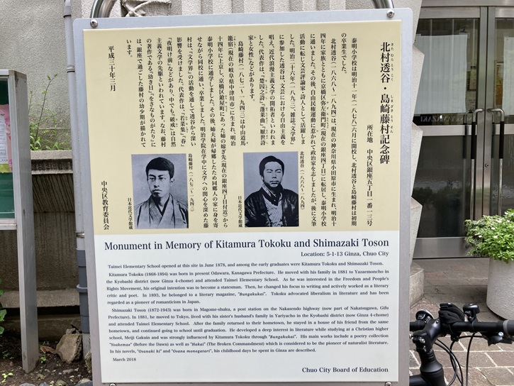 泰明小学校は明治十一年(1878年)六月に開校し、北村透谷と島崎藤村は初期の卒業生でした。