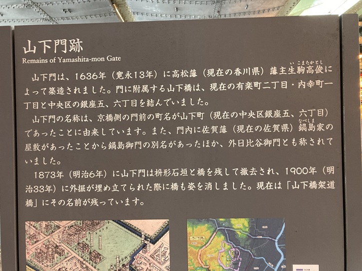 Yamashita-mon Gate was constructed by Ikoma Takatoshi, the feudal lord of the Takamatsu Domain (current-day Kagawa Prefecture) in 1636. Yamashita-bashi Bridge, the bridge leading to the gate, connected current-day Yurakucho 2-chome and Uchisaiwaicho 1-chome with Ginza 5-chome and 6-chome in Chuo-ku. The name comes from Yamashitacho (current-day Ginza 5-chome and 6-chome in Chuo-ku), the