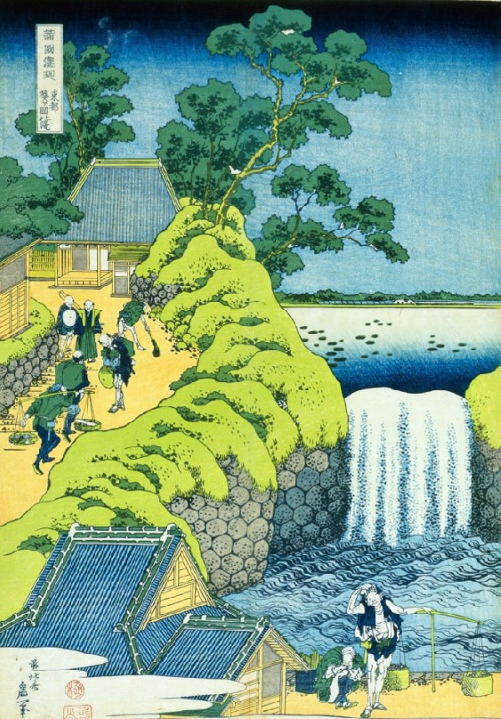 現在は埋め立てられ、面影もないが、これは溜池の堰から流れ落ちる水によって形成されていた虎ノ門近くにあった滝。その水音から「どんどん」の愛称で親しまれていたという。左下の建物は金比羅大権現(現金刀比羅宮)。江戸の景勝地のひとつとして知られ、広重も名所江戸百景「虎ノ門外あふひ坂」などの作品を残している。