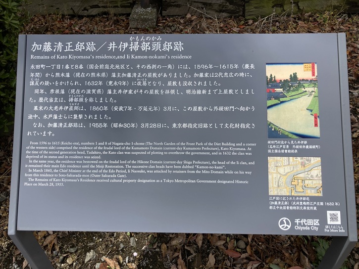 This is the site of the Kojimachi mansion of the li family. The mansion stood here through most of the Edo period (1603-1867). Ii family members were top "fudai" hereditary vassals. Ii Naosuke was a famous chief minister of the shogun in the final days of the Tokugawa Shogunate. After the Meiji Restoration (1872) this district became known as Kioi-cho, after the first initials of the Kii-Tokugawa, Owari-Tokugawa and li families.