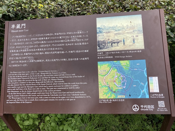Kai Province (now Yamanashi Prefecture). It is said that the name was derived from that of the leader of the Iga-mono (ninja who practiced the Iga style of their art), Hattori Hanzo, who was given a residence in this area, along with his followers. Alternatively, it is also claimed that the wheeled floats of the Sanno Festival, which tried to enter the castle from this gate, were unable to get past the Masugata Gate (which had a square enclosure for soldiers to gather), and so only half (han) of the floats were able to enter. This gate was constructed in 1620 by either Date Masamune, or the six daimyo (feudal lords) of the eastern provinces. In the Edo Period (1603-1868), people could enter from the Hanzo-mon Gate and travel northwards, along the modern Daikancho-dori street, and exit from the Takebashi-mon Gate (near Takebashi Station).