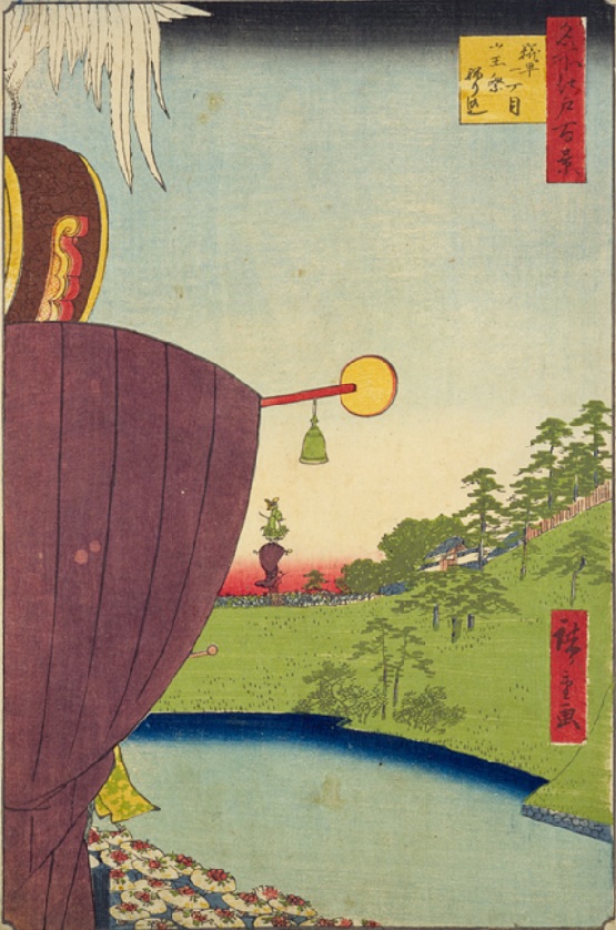 「山王」は、初代の画風にならい、幕末の江戸の名勝や話題のスポットを取り上げて風景画を描いた二代目歌川広重の「江戸名勝図会」シリーズの一作です。山王男坂を登り、楼門(随神門:現在の神門)をくぐった先の光景を描いています。「江戸第一の大社(おおやしろ)で、金殿玉楼(きんでんぎょくろう)の輝き」という解説が付けられています。