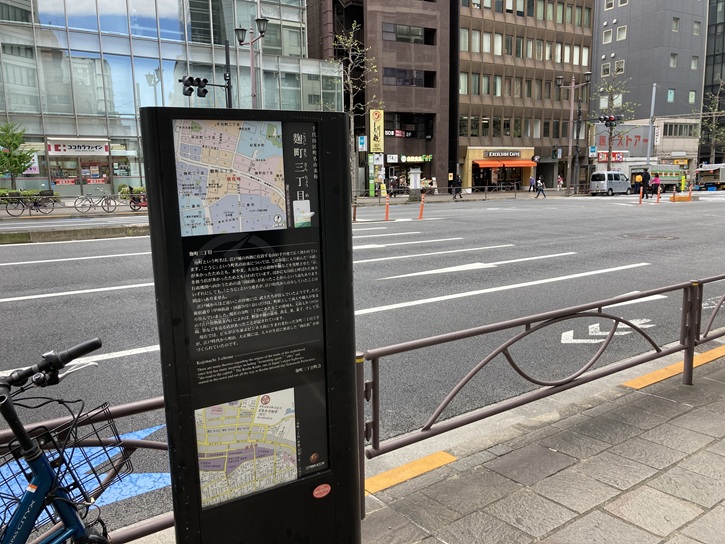 半蔵門交差点を左折し、麹町大通りを西に向かいます。歩道脇に麹町の町名の由来を記した案内板が立っています。