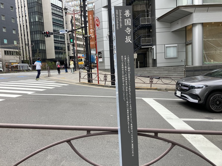 案内板の直ぐ先で麹町大通りから下る坂があります。善国寺坂は長さが約100mほどの緩やかな坂で、坂名は昔この坂上に鎮護山善国寺というお寺があったことに由来します。